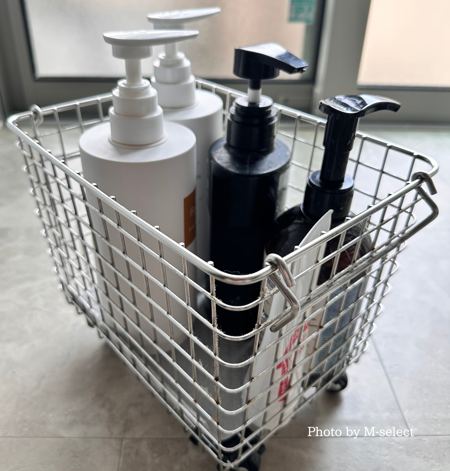 以前はボトルの入ったカゴを「洗濯機の上」に置いてた時期もあったけど、どうにも面倒くさい…。